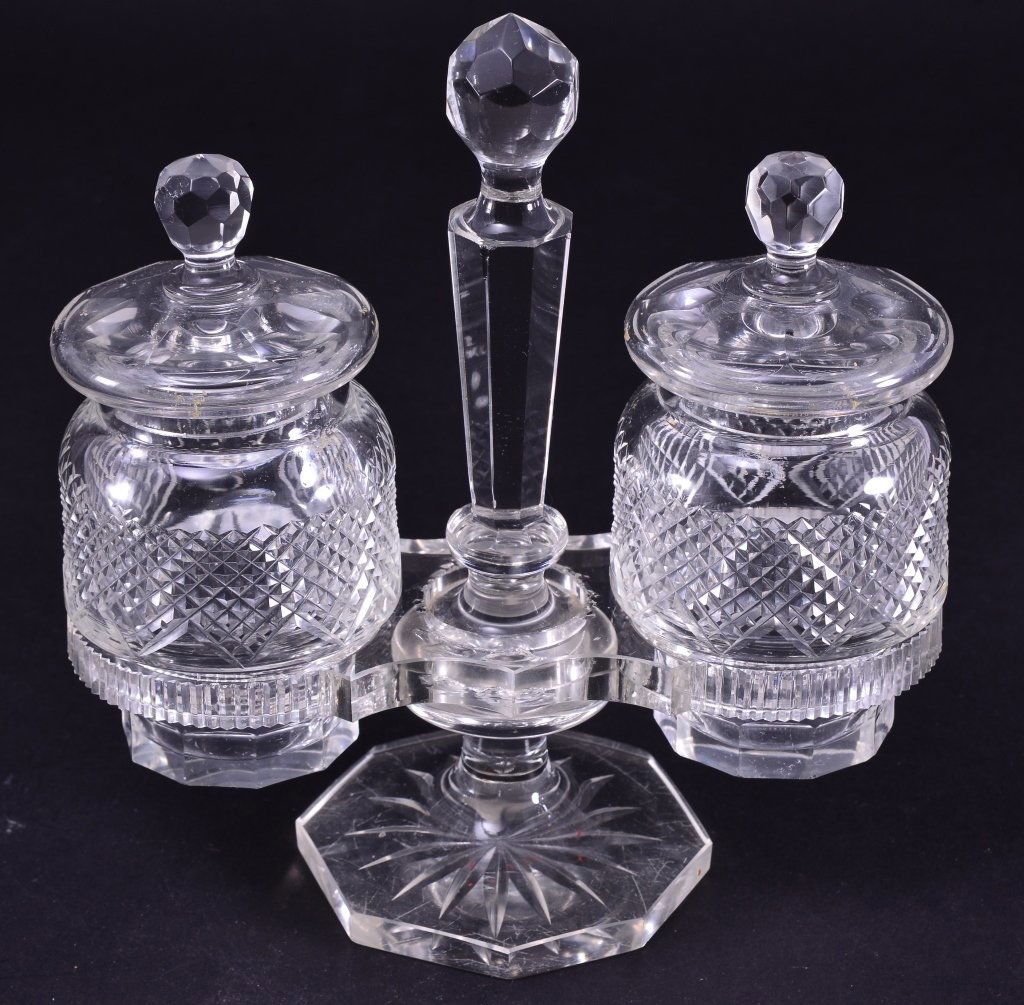 Two Cut Crystal Condiments on Stand
