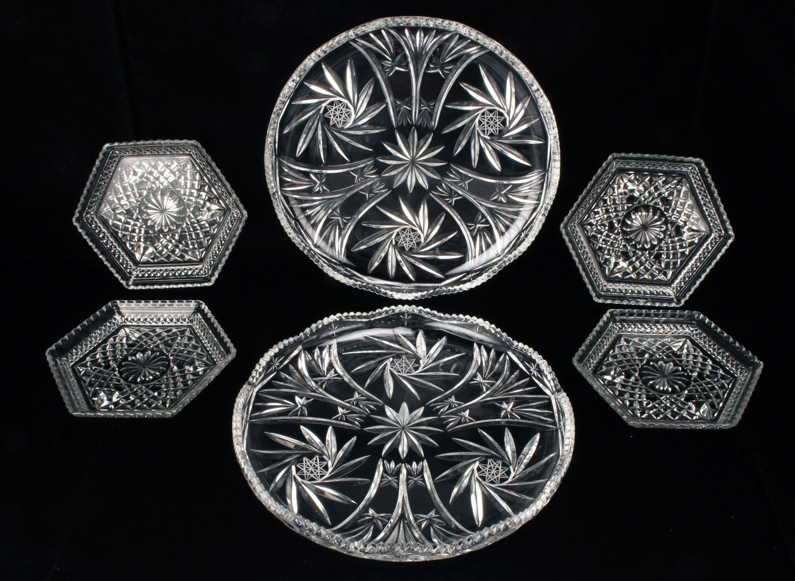 TWO CUT GLASS SERVING PLATTERS & FIVE DISHES