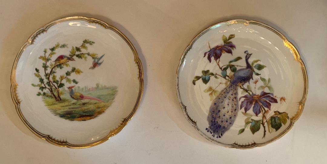 Two Derby bird hand painted dishes plates