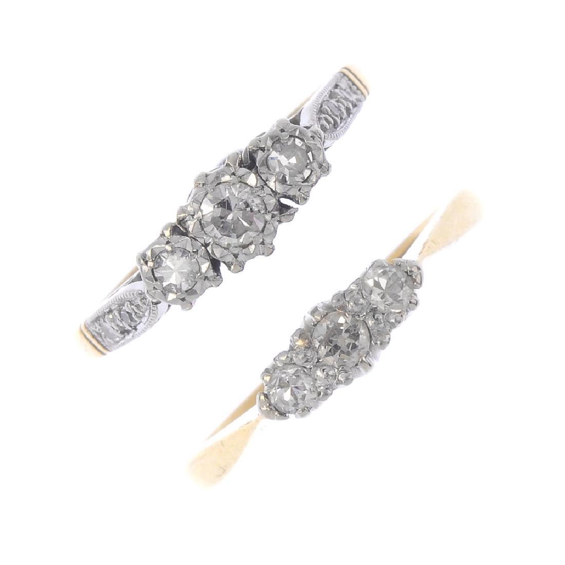 Two diamond three-stone rings. To include a single-cut