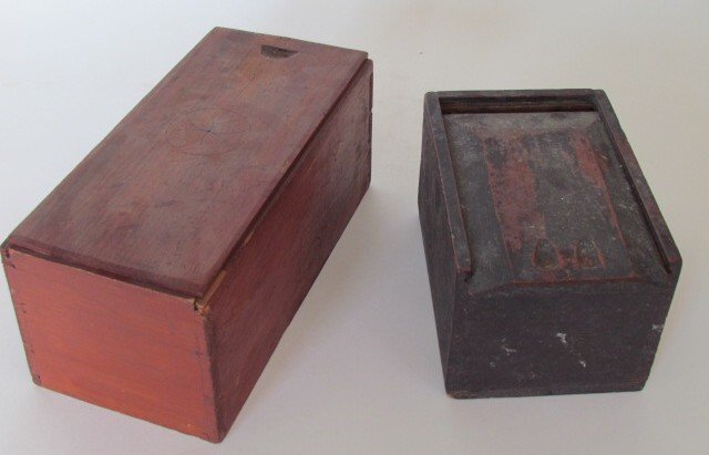 SoldTwo Early 19thC Candle BoxesTwo Early 19thC Candle Boxes. A) Popular wood single candle box with sliding lid, two compartments interior with lock and key, 12 1/4" long x 9" wide x 5 1/4" tall. B) Pine wood double candle box withSee Sold Price