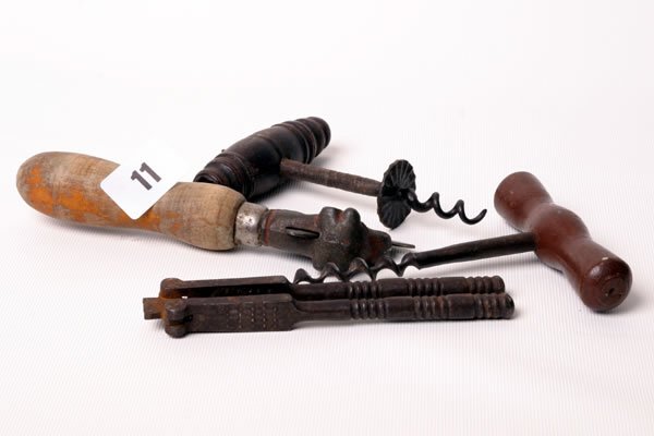 Two early corkscrews, tin opener and nut crackers