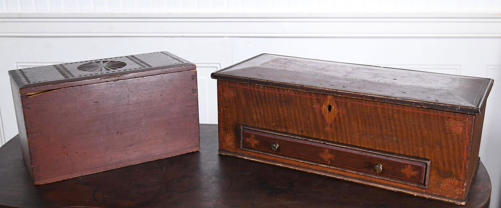 Two George III Mahogany and Marquetry Tea Caddies4 days LeftLot of 2 18thC lift top boxes incl valuables maple in gray & wagon box in red paint - 5 1/4" tall x3 days LeftVintage English Bench Made Reproduction Inlaid Tea Caddies, Pair7 days LeftTwo early document boxes: The first, a miniature walnut blanket box with a footed base and withMar 29, 2026Two federal work tables with NY legs. The first, in cherry, a 2 drawer drop leaf sewing stand, circaMar 29, 2026TWO LIFT-TOP BOXES 20th Century Heights to 5". Widths to 12". Depths to 9".4 days LeftTwo small early lift top document boxes in original paint, together with a folding game board. TheMar 29, 2026Pair of Cherry One Drawer Night StandsApr 06, 2026Pair of Paint Decorated Oriental One Drawer Night StandsApr 06, 202619TH C. DOVETAILED BOX23 hrs LeftPair of vintage Heritage Henredon Furniture solid mahogany 1 drawer step tablesMar 29, 2026Antique 19th Century Legged And Lidded Wooden Jewelry Chest Box, France, Small Furniture AccessoriesMar 29, 2026Antique Mahogany Candle BoxMar 29, 2026Wooden Dovetailed Storage BoxMar 29, 2026