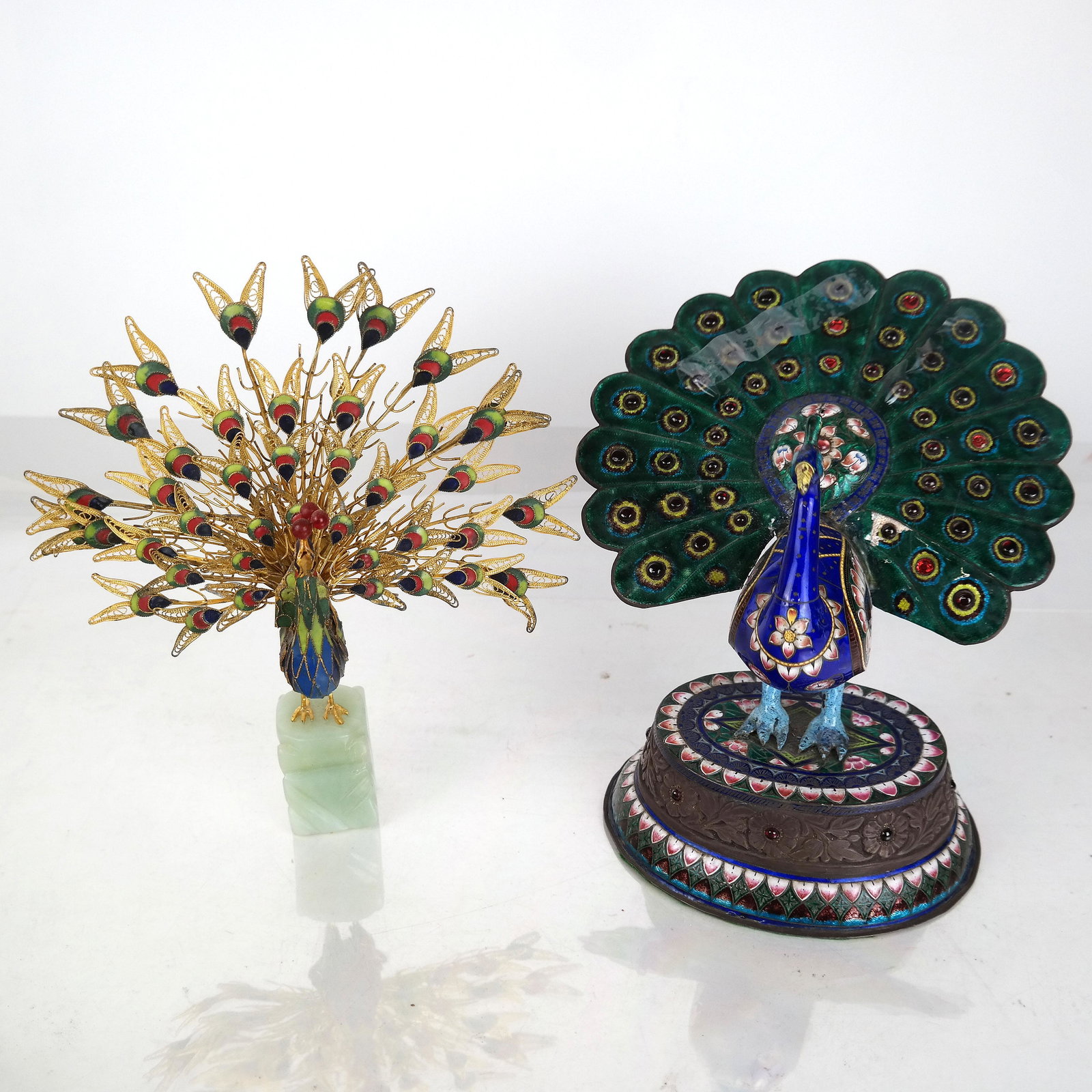 Two Enamel Peacock Sculptures