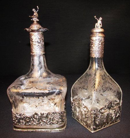 TWO ENGRAVED GLASS SILVER MOUNTED DECANTERS