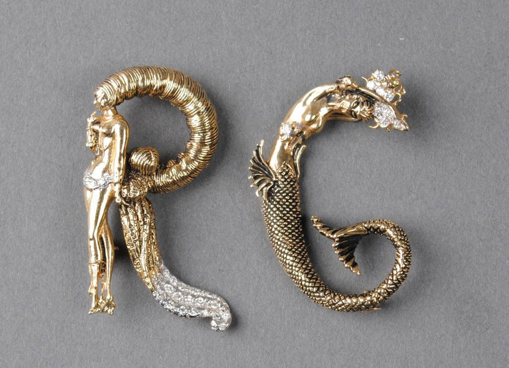 TWO ERTE DIAMOND INITIAL PINS - R & G