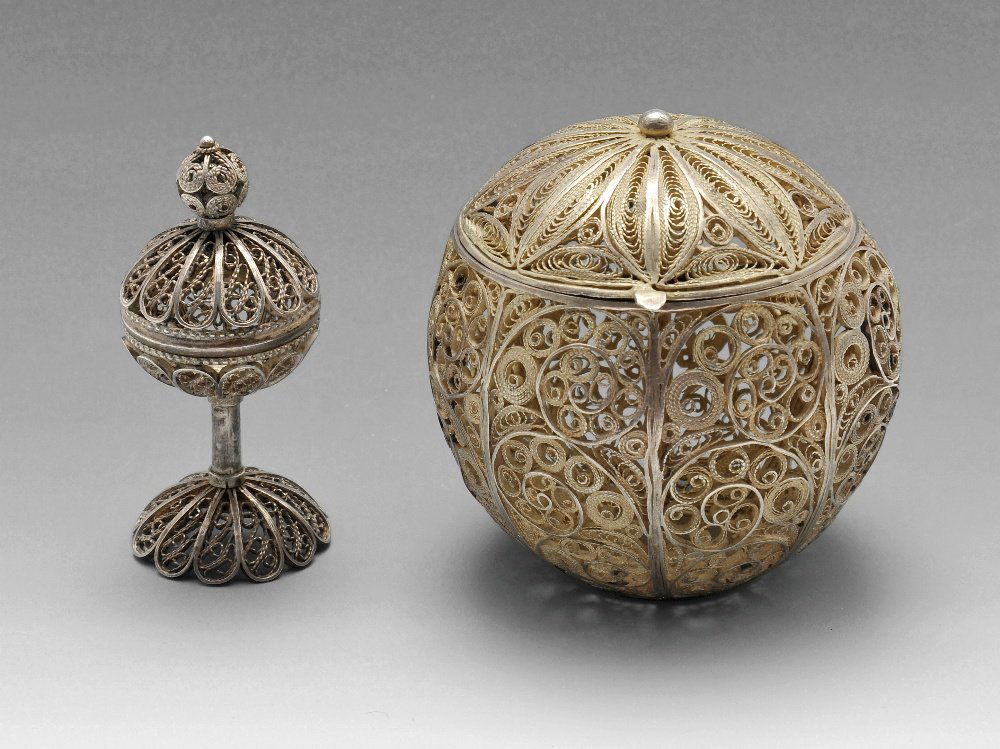 Two filigree spice containers.