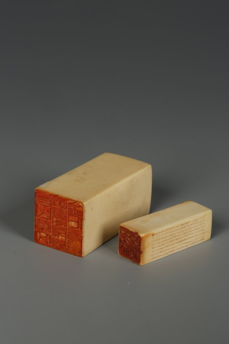 TWO FINE CHINESE IVORY SQUARE SEALS, the larger example