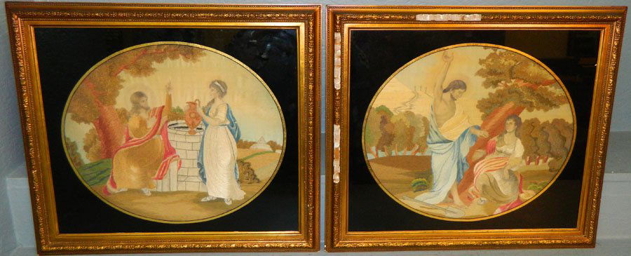 Two framed Biblical needleworks on silk.
