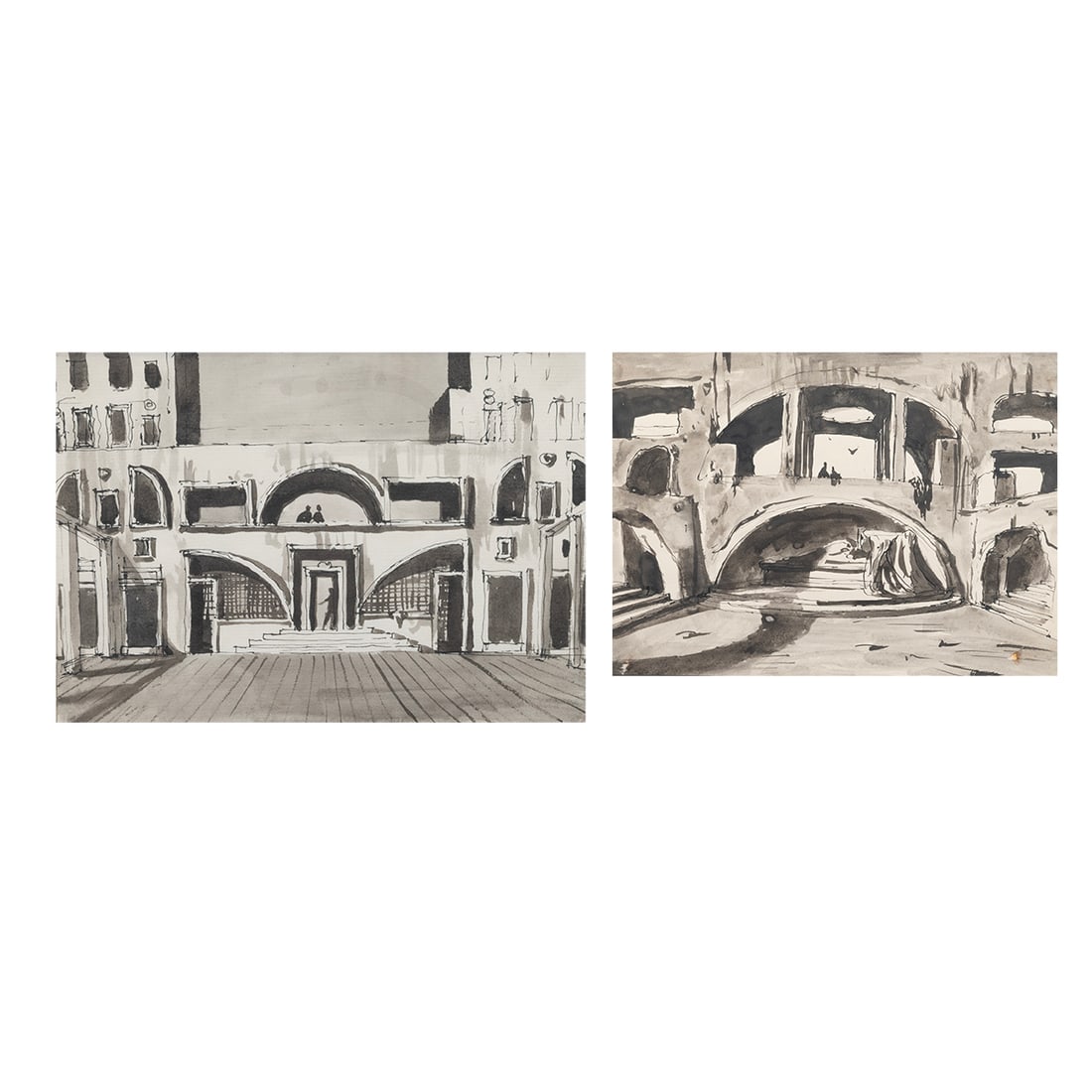 Two Framed Ink Wash Architectural Landscapes