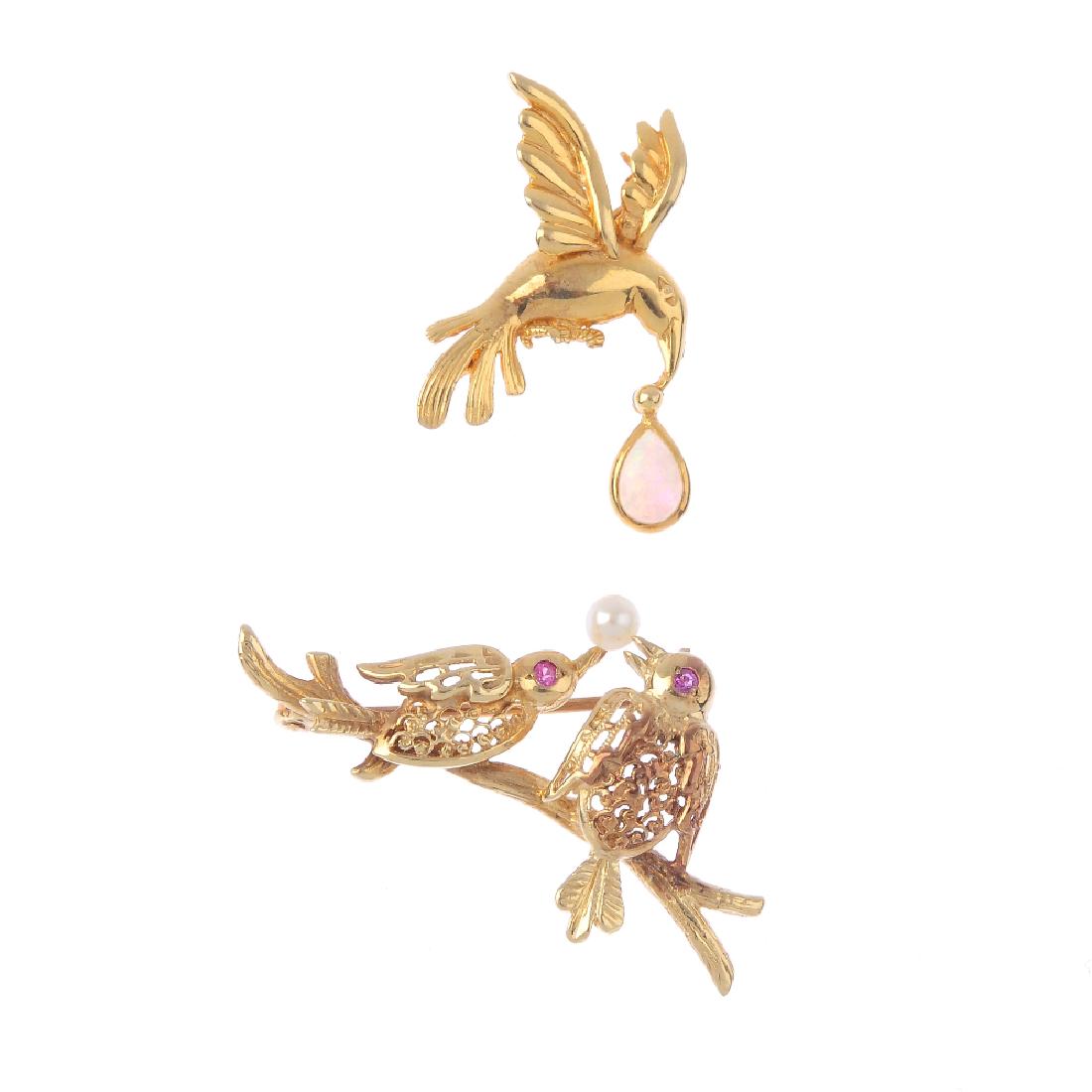 Two gem-set bird brooches. The first designed as two