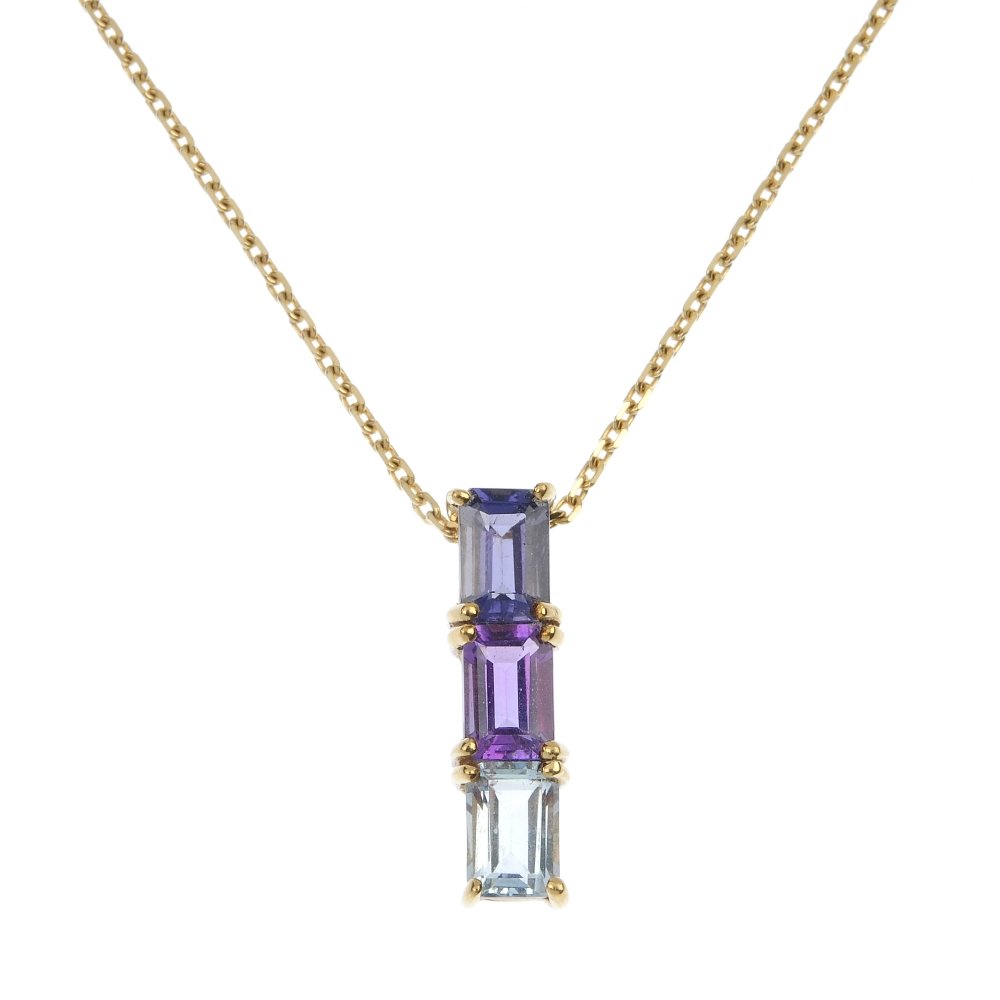 SoldTwo gem-set pendants and chains.Two gem-set pendants and chains. To include a 9ct gold rectangular-shape smoky quartz openwork pendant suspended from a 9ct gold chain, together with a calibre-cut sapphire and diamond point heart-shaSee Sold Price
