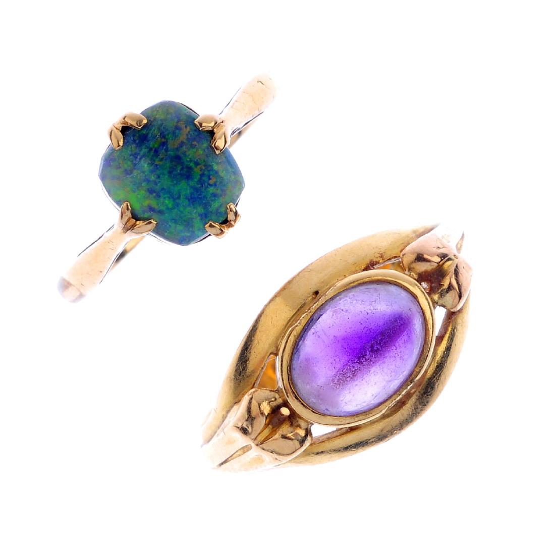 Two gem-set rings. The first, a cushion-shape boulder