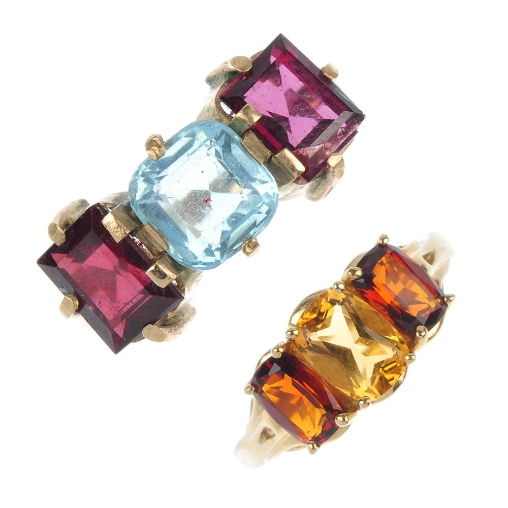 Two gem-set three-stone rings.