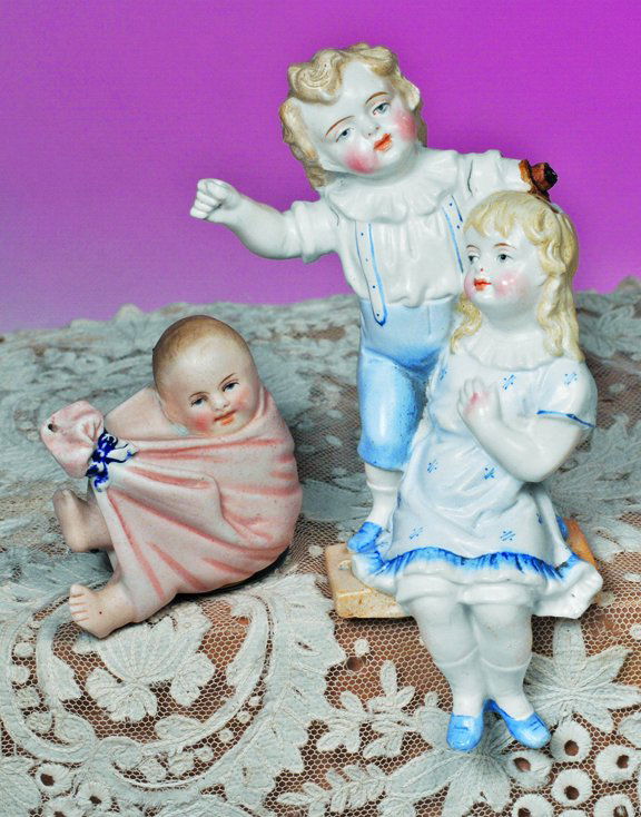 TWO GERMAN BISQUE SWINGING FIGURES. 2 ½" baby wit