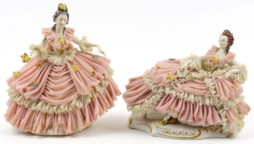 TWO GERMAN DRESDEN LACE PORCELAIN FIGURES