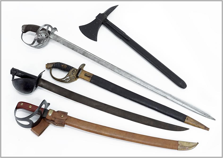 Two German Prussian WWI Swords, the hinged guard featuring a Prussian eagle, the wire wrapped handleTwo German Prussian WWI Swords, the hinged guard featuring a Prussian eagle, the wire wrapped handle with an applied crown. The blade is 32 inches long. one has the proper leather covered scabbard, th