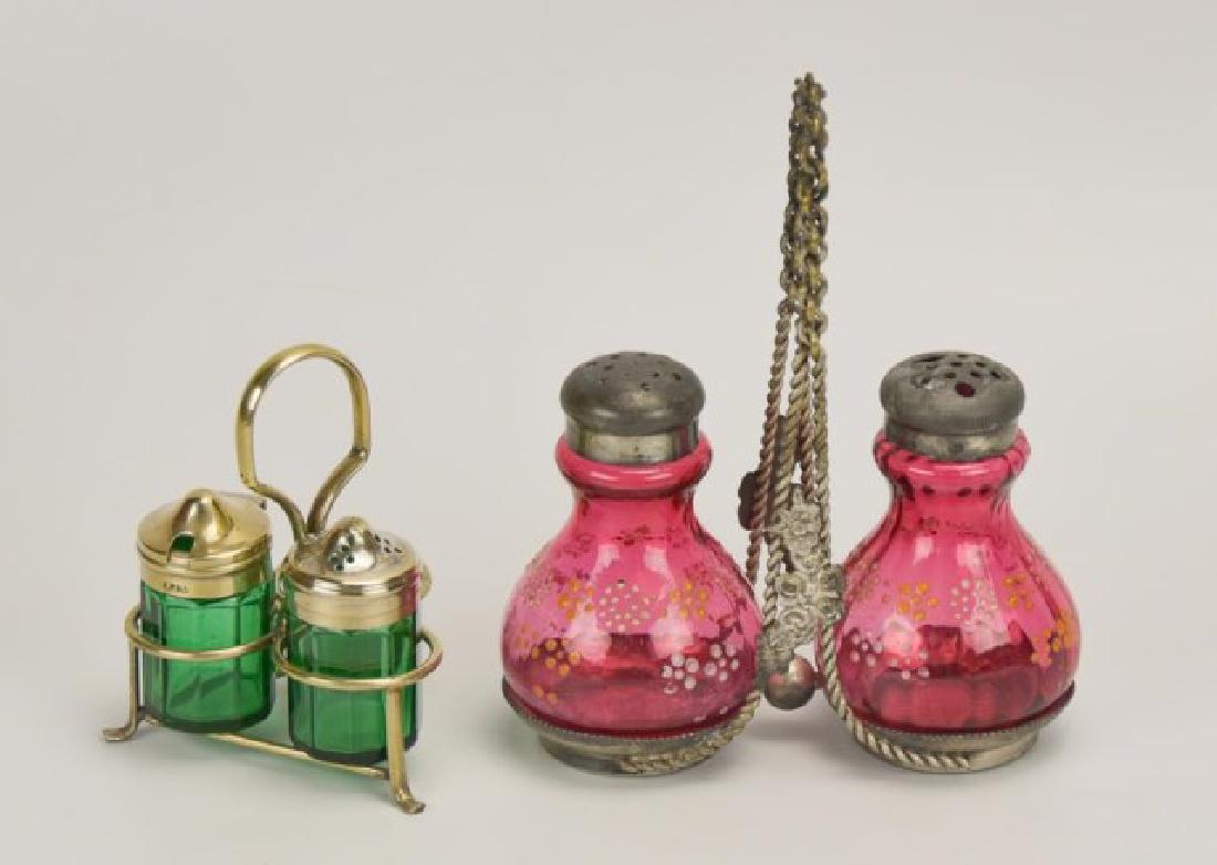 Two Glass Condiment Sets in Stands