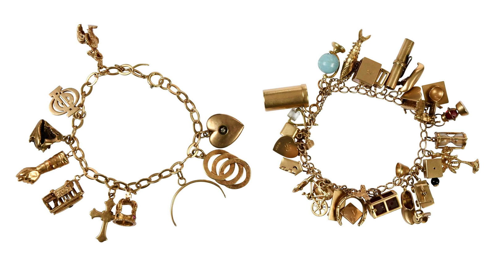 SoldTwo 14k Gold Charm BraceletsOne with 13 charms that are travel themed, the other with 3 charms. Two charms are base metal, all else and chains are 14k. Dimensions:The total approximate gross weight is 35.5 dwt. Provenance:From aSee Sold Price