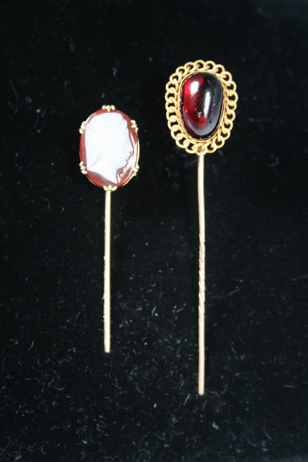 SoldTwo Vintage Stick PinsTwo Vintage Stick Pins, 14k tested pin with pear shaped white coral top and one gold filled pin with oval cut amethyst and four seed pearls. Very good vintage condition. 2 3/4" and 2 1/2". CONDITION:See Sold Price