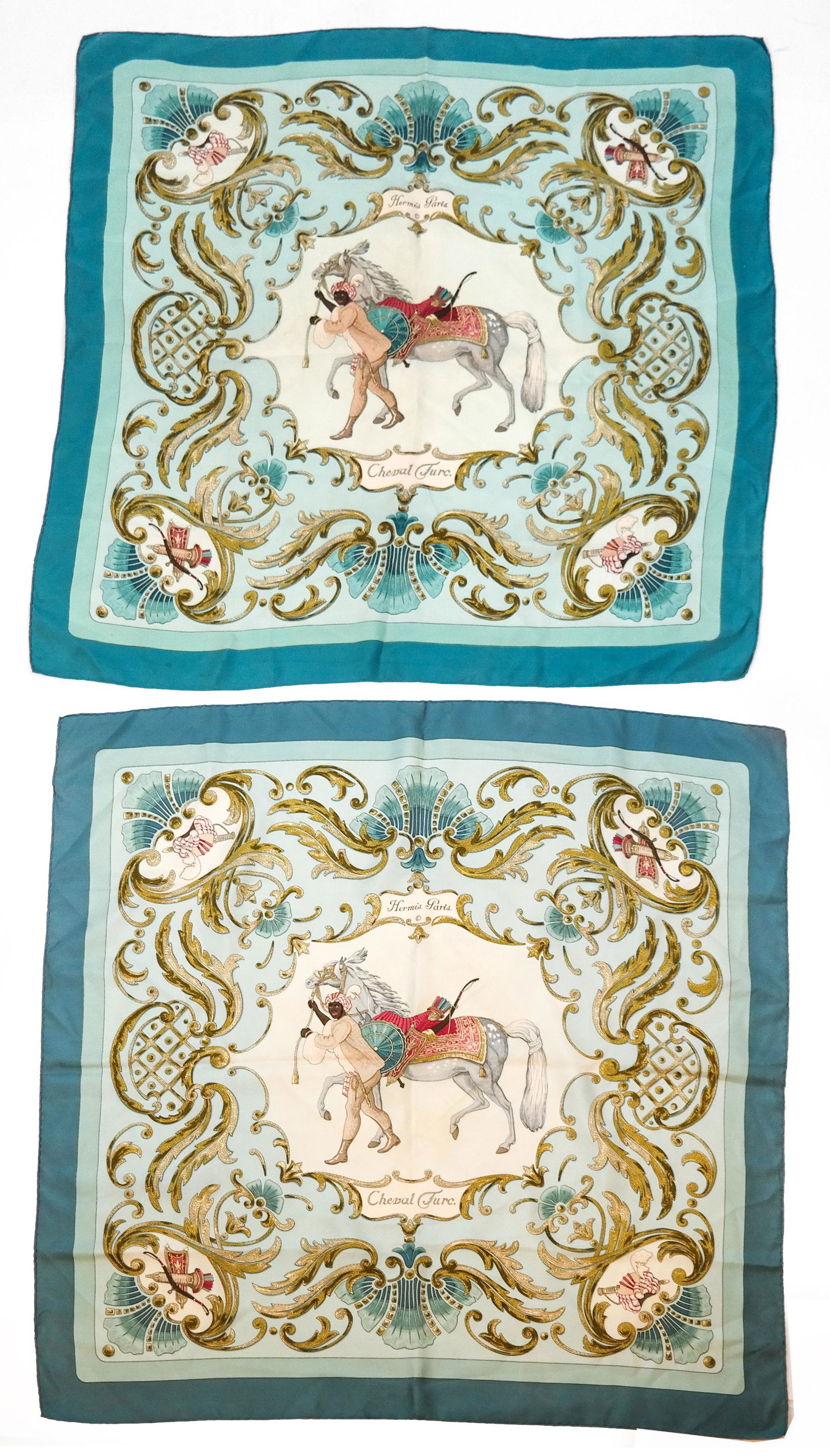SoldTwo Hermes Silk ScarvesTwo Hermes silk scarves; 100% silk, 1 turquoise with Native American Cocchina Dolls and 1 "Cirque Molier"See Sold Price