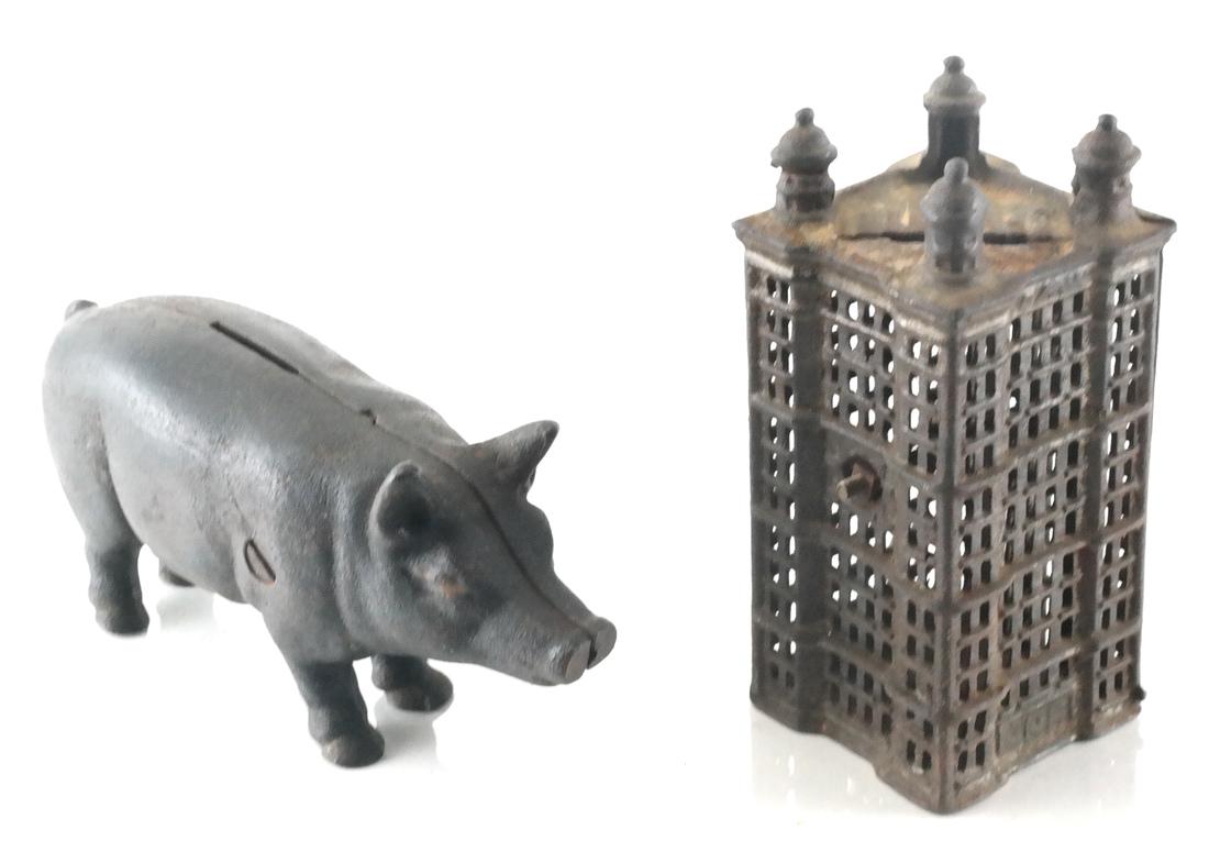 SoldTWO CAST IRON BANKSCAST IRON BUILDING BANKS. VILLA BY KEYSER & REX. SCHOOL HOUSE BANK. 5 1/2" H x 4 3/4" W. & 6" H x 5 1/2" W.See Sold Price