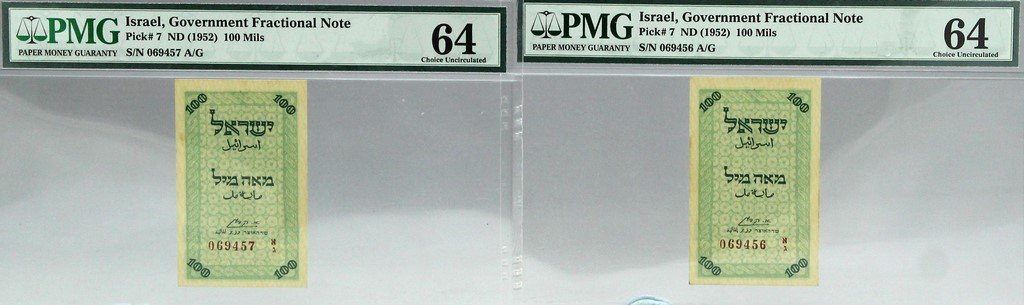 Two Israeli 100 Mils "Carpet" Banknotes, Consecutive