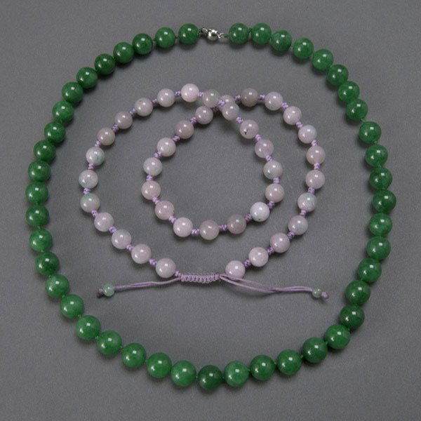 SoldTwo Jade Beaded NecklacesOne jade and crystal beads with jade pendant 9 1/2", and jade beads 15 1/2". Estimate $200 - $300 Starting Bid $20See Sold Price