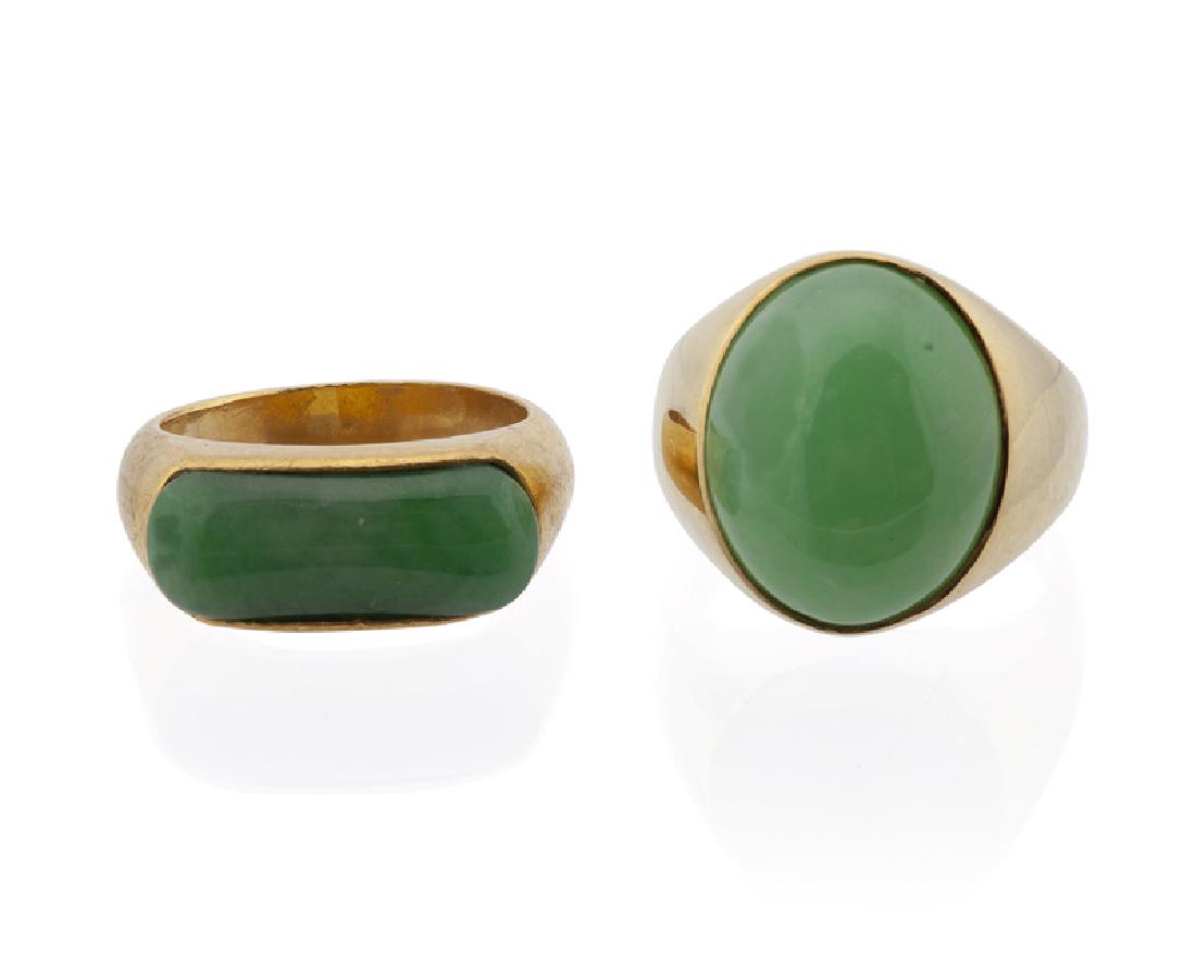 SoldTwo 14K Yellow Gold & Jadeite RingsTwo 14K yellow gold rings; each centering an oval-form jadeite; one in a four-prong setting; the other in a six-prong setting, with incised floral-motif shoulders; total weight approx. 15.6 grams; sizSee Sold Price