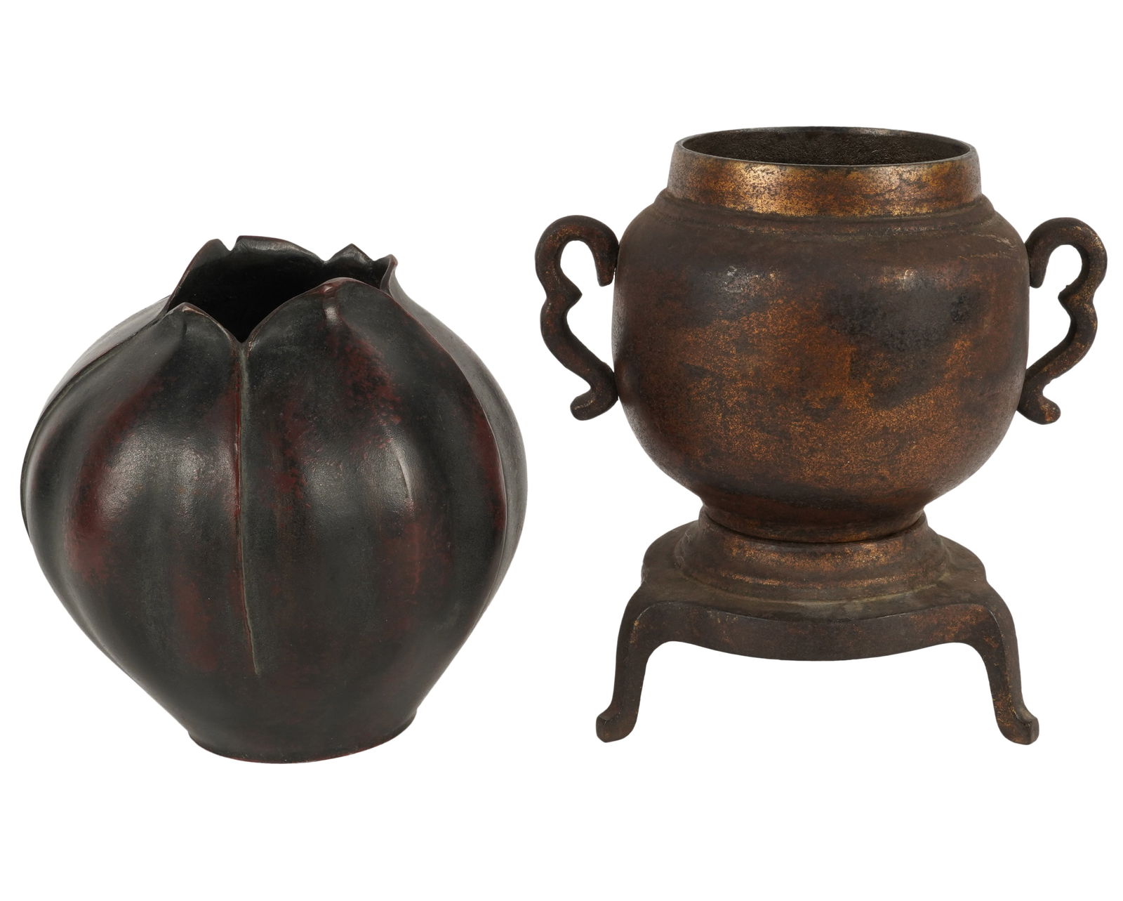 SoldTwo 19th c Japanese Bronze VesselsTwo 19th c Japanese Bronze Vessels, including footed Ikebana vase, heater, both with mixed metals decoration, hts 10", 9 1/2"See Sold Price