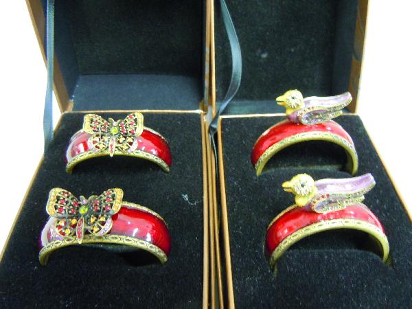 Sold10 JAY STRONGWATER NAPKIN RINGSTURTLE, FROG, DRAGONFLY, BUTTERFLY, & FLORAL. WITH BOXES.See Sold Price