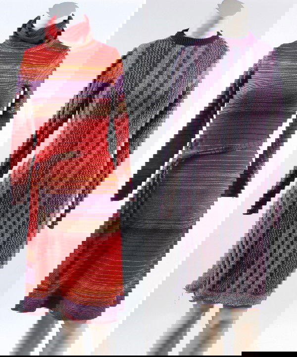 SoldTwo Missoni Knit Dresses, 1990-2000sTwo Missoni Knit Dresses, 1990-2000s This lot includes two knit dresses. THE FIRST Tan alpaca/wool blend knit dress with ribbed wrap collar, drop waisted sweater top with rib knit cuffed long sleeves,See Sold Price