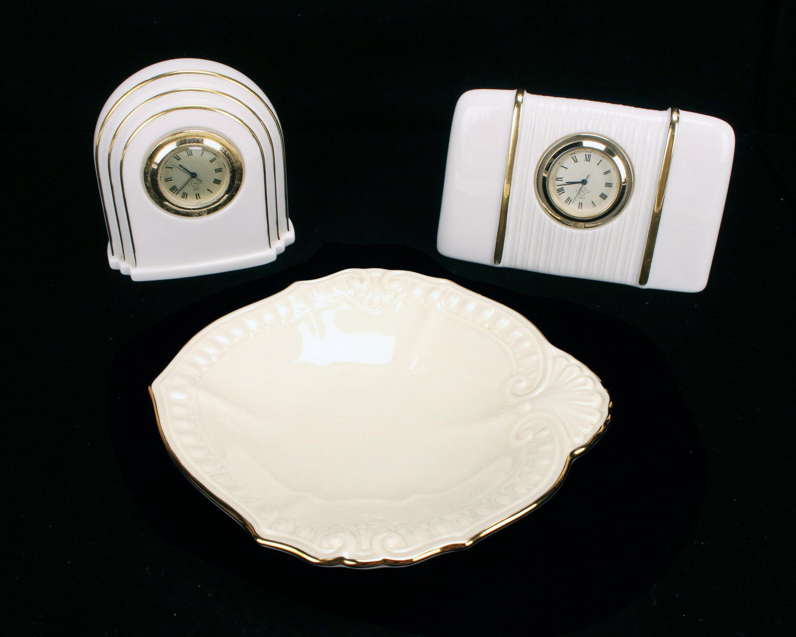 TWO LENOX PORCELAIN CLOCKS & DISH