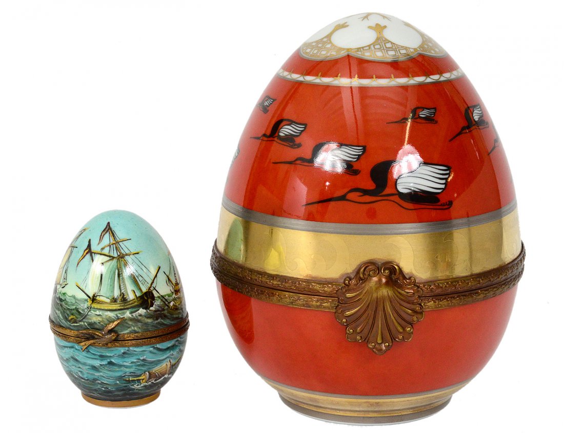 TWO LIMOGES BRASS MOUNTED PORCELAIN EGG SHAPED BOXES