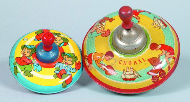 Two Lithograph Tin Spinning Tops: one marked "Chor
