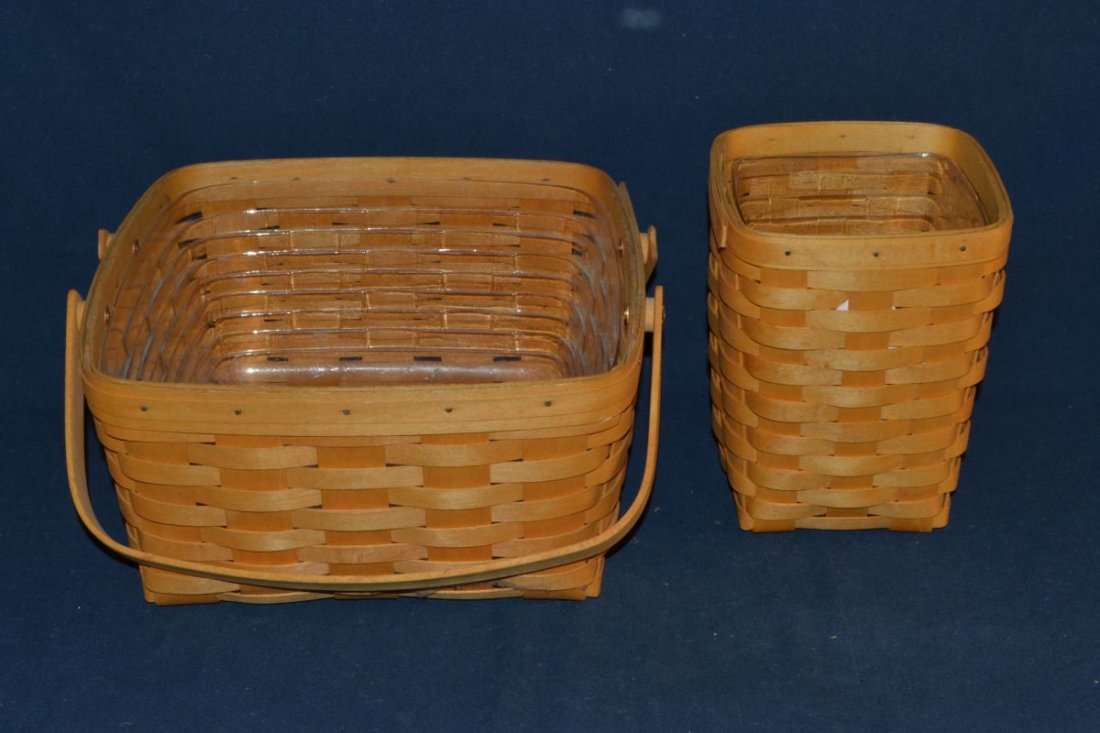 Two Longaberger Baskets - both signed - large with liner and handle, Flat Basket / Serving Tray withTwo Longaberger Baskets - both signed - large with liner and handle, Flat Basket / Serving Tray with liner and plastic tray All pictures are considered part of the description and should be examined c