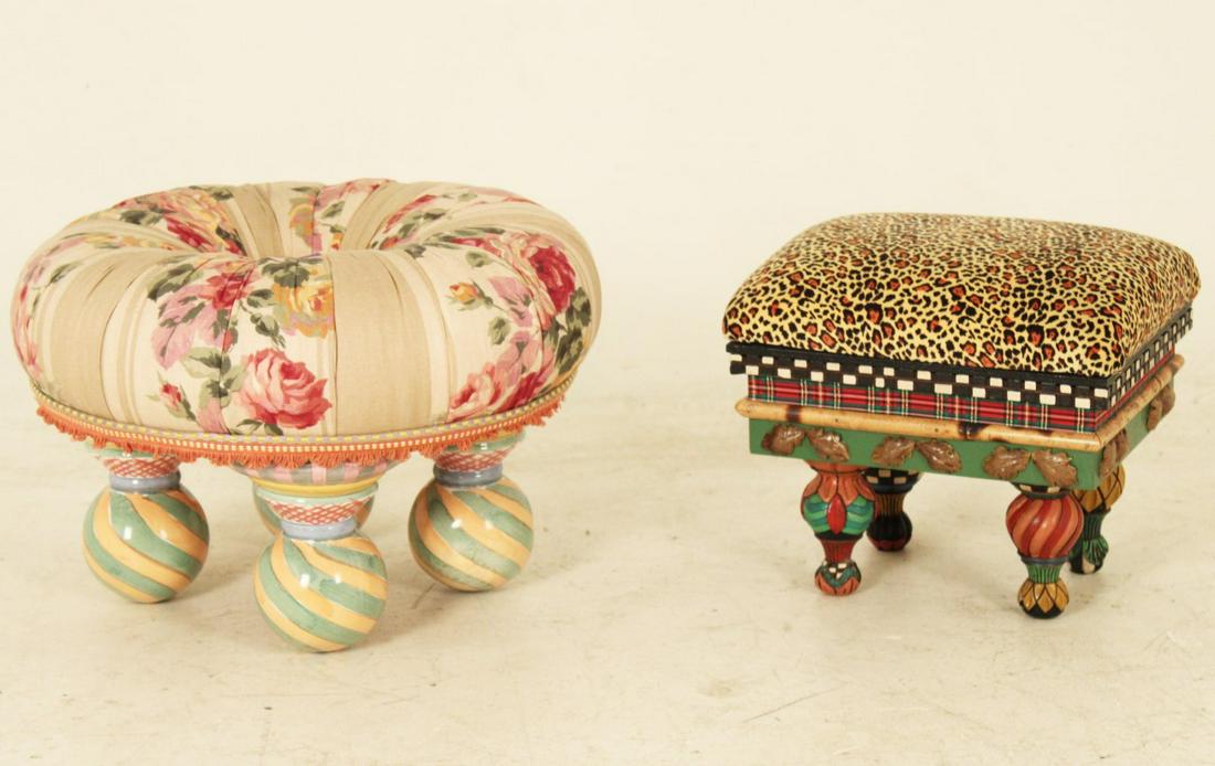 TWO MACKENZIE-CHILD'S UPHOLSTERED STOOLS