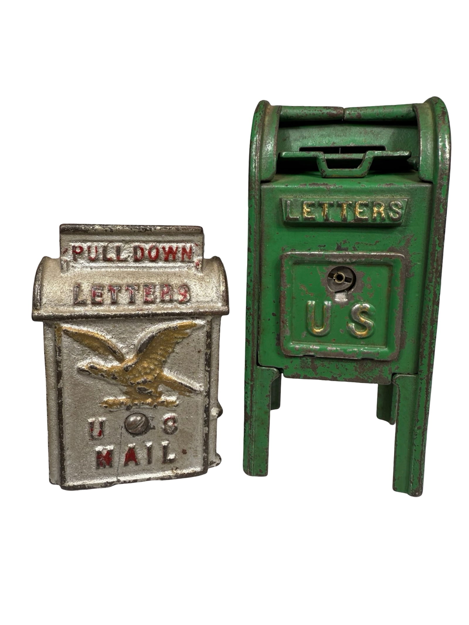 SoldTwo Mailbox BanksMade by Kenton circa 1930's. Both made of Cast Iron. 3 5/8" - 4 1/8" Tall. Very Fine to Excellent Condition.See Sold Price