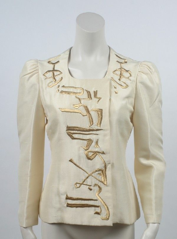 SoldMary McFadden Couture100% Silk Jacket with Egyptian Hieroglyphics Design, size 12, Front c ollar to Bottom 27", Shoulder to Bottom 30", Shoulder to Shoulder 27", Collar to Shoulder 5.5", Shoulder to Cuff 25", Back CollarSee Sold Price