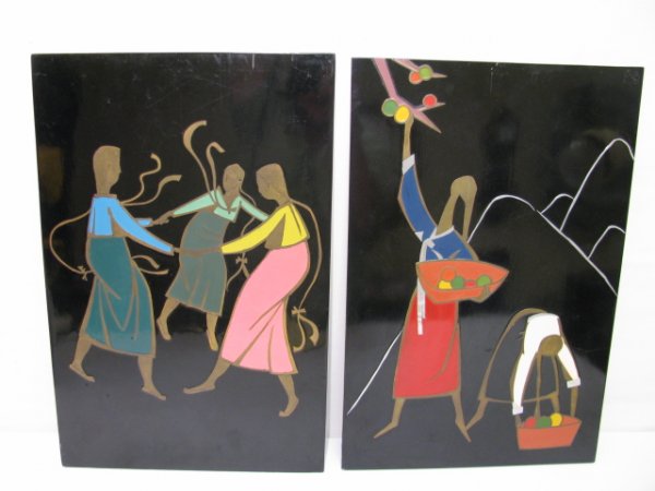 TWO METAL ENAMEL & BLACK LACQUER PANELS