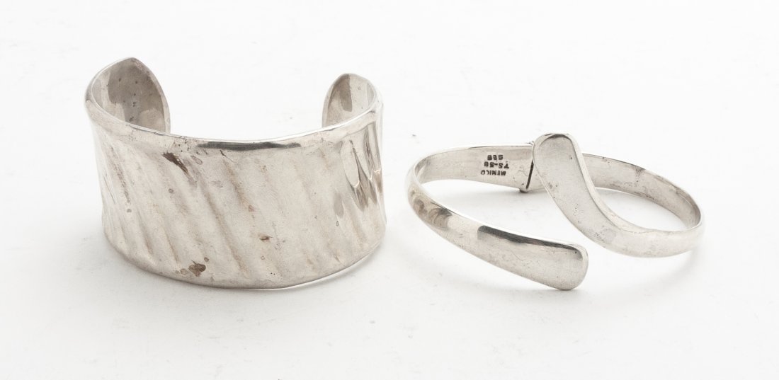 Sold2 Mexican Sterling Silver BraceletsGroup of two Mexican sterling silver bracelets. Numbers TS-102 and TA-89.(Shorter) length: 7 3/4 in. (Longer) length: 8 3/4 in. Gross weight: 93.3 g.See Sold Price