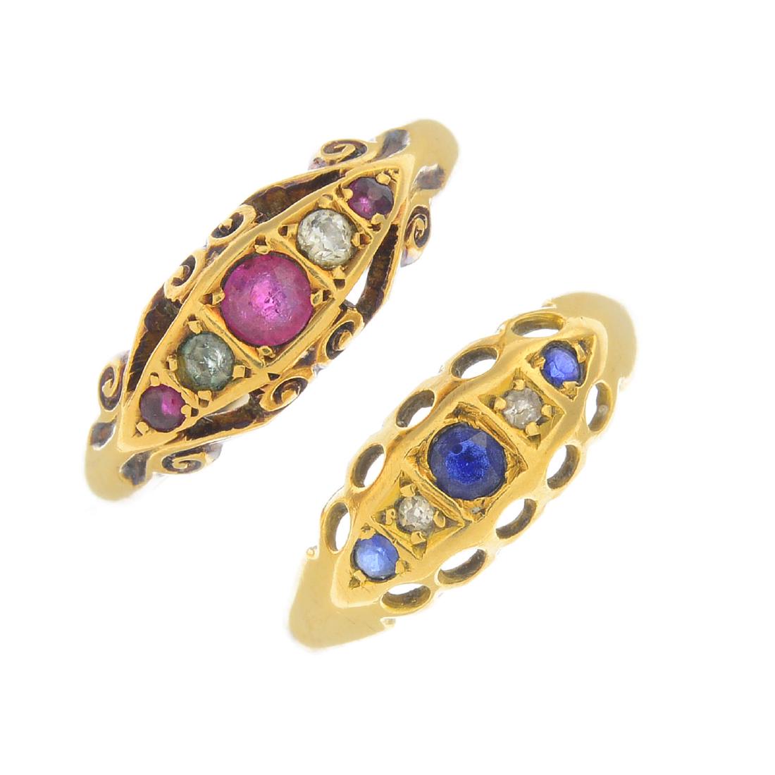 Two mid 20th century gem-set and diamond five-stone