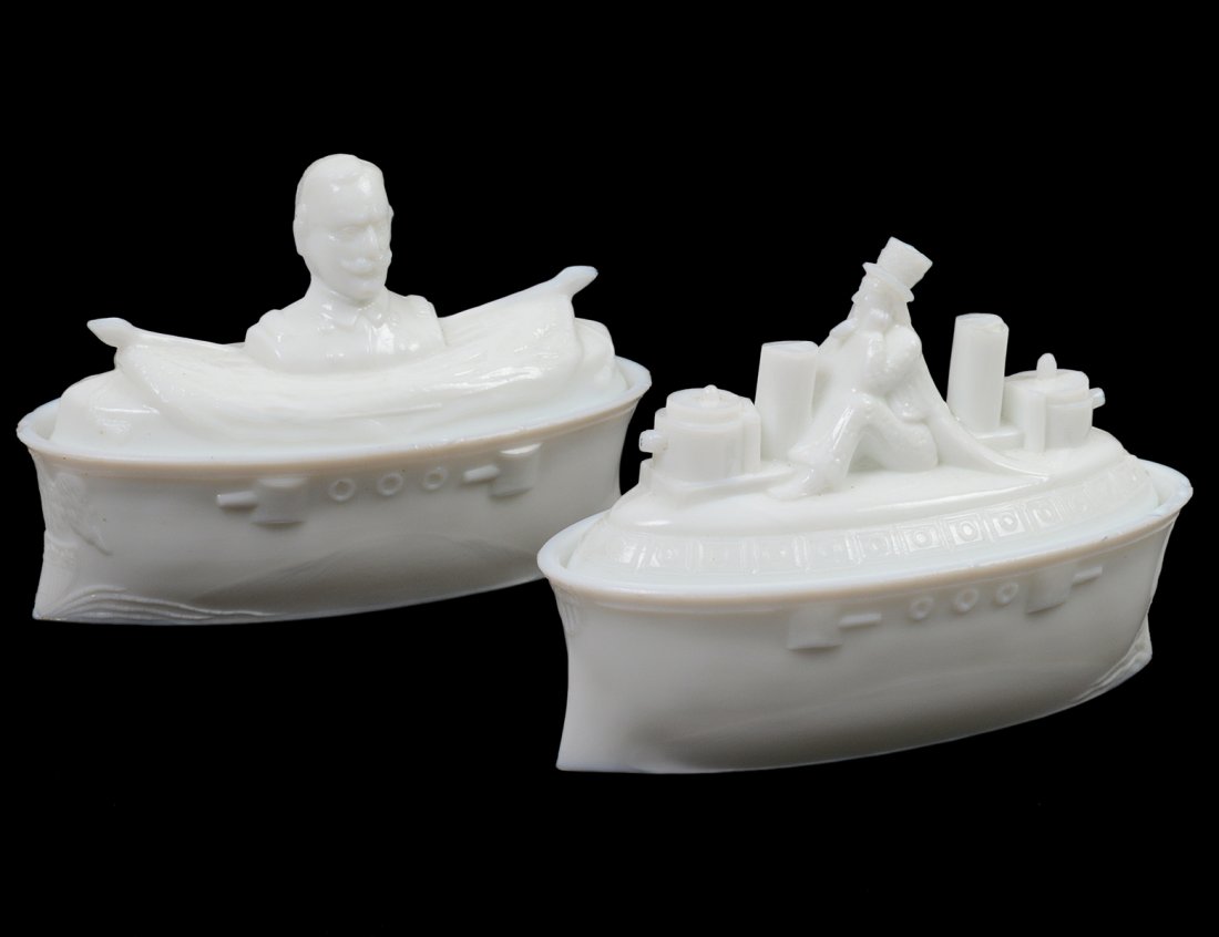 TWO MILK GLASS IRONSIDE THEME COVERED BOXES