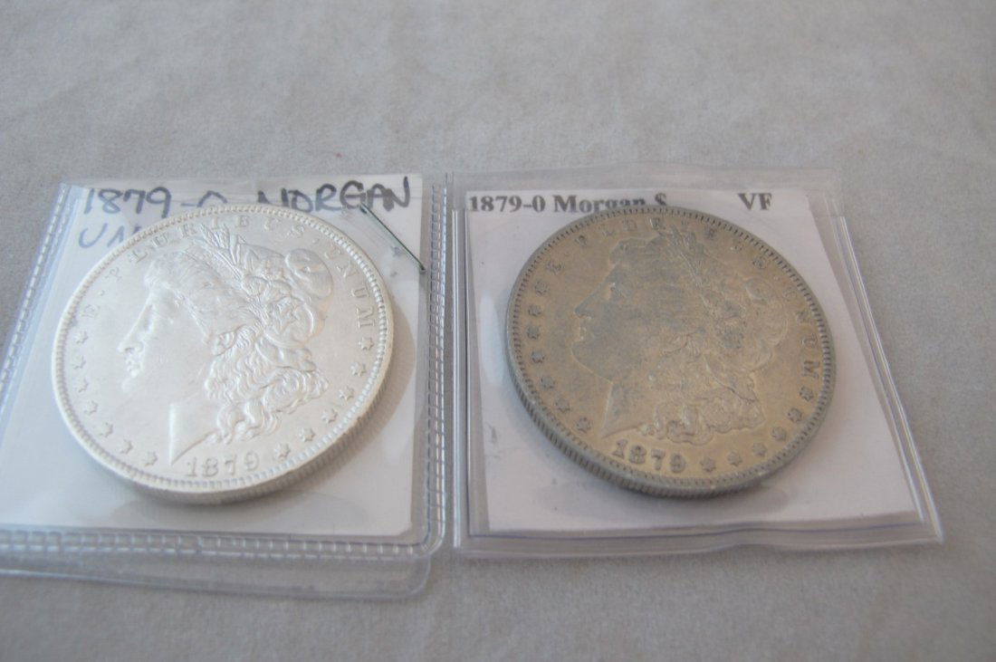 Two Morgan Silver Dollars 1879o Vf, 1879o Unc