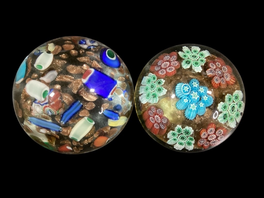 SoldTwo Murano Millefiori Glass PaperweightsTwo Murano millefiori glass paperweights, mid- to late 20th century, internally decorated with flower motifs. [Larger: 2 1/2" H x 3 3/8" Diam.].See Sold Price