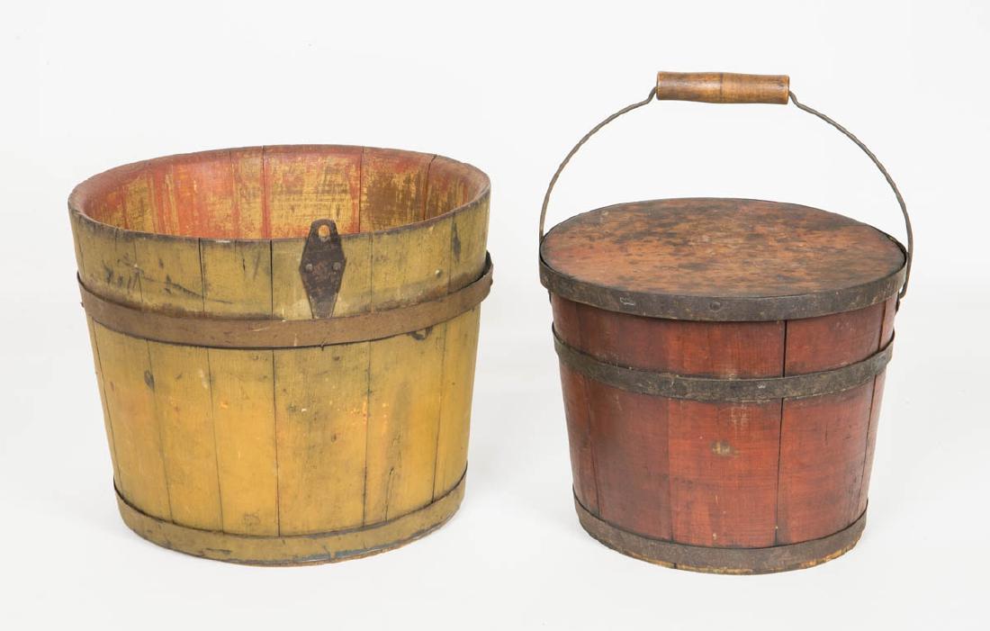 TWO PAILS Maple sugar pail, pine, original yellow