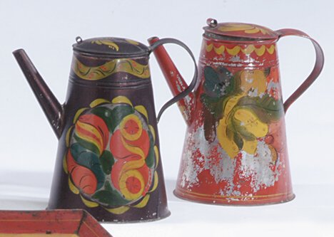 SoldTole Decorated Coffee Pot and Tea CaddyTole decorated coffee pot and tea caddy. Northeastern United States. 19th century. Condition: Very good original condition with minor imperfections to paint. Coffee Pot H 10-1/2" W 10-1/4". Red Tea HSee Sold Price