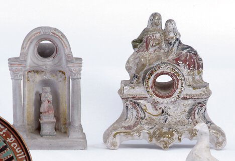 TWO PAINTED CHALKWARE WATCH HOLDERS The first in