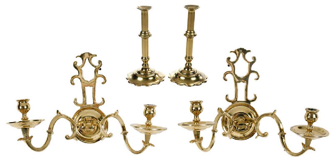 Two Pairs Brass Candlesticks And Sconces