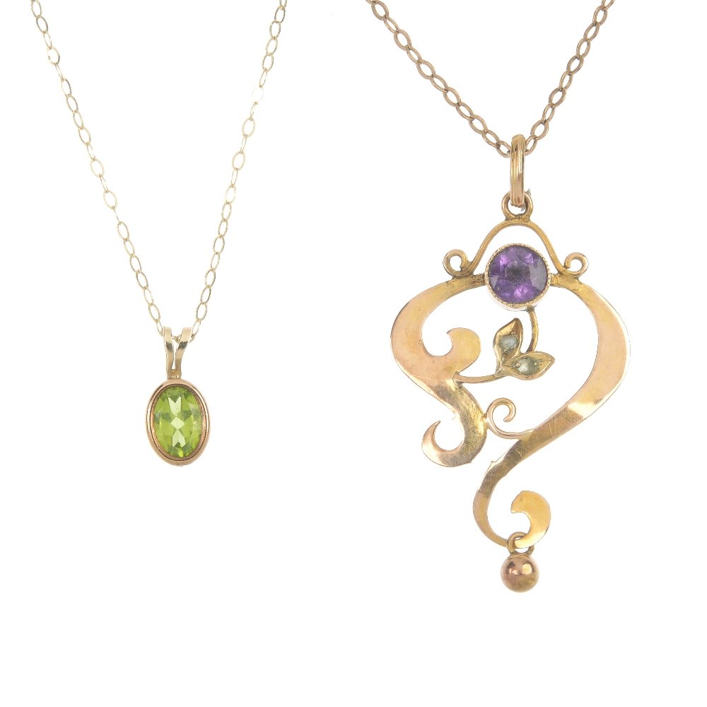 SoldA selection of four gem-set pendants and three chains.A selection of four gem-set pendants and three chains. To include a 9ct gold pear-shape citrine single-stone pendant, a peridot and diamond point pendant, two further pendants and three fine-link chaiSee Sold Price